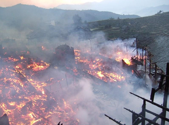 2013年3月,云南麗江古城光義街現(xiàn)文巷突發(fā)火災(zāi),燒毀民房107間;2013年4月,湖南鳳凰古城發(fā)生大火,由于消防通道狹窄無法迅速撲救,幾棟古房屋及其內(nèi)酒吧被徹底燒毀;2017年4月,古城一處街角再次發(fā)生火災(zāi);2013年8月,湖南靖州苗族侗族自治縣一古村寨發(fā)生火災(zāi),共造成58戶、248名村民房屋被燒毀;2013年10月,湖南洪江古商城清代古建筑“曾國藩兵服廠”旁一棟老民居突發(fā)大火,11戶居民無家可歸;2013年12月,洪江古商城建于清末民初的朱志大油號舊址在一次大火中付之一炬,造成22戶67人受災(zāi);頻發(fā)的火災(zāi),不僅給人民生命財產(chǎn)帶來損失,而且許多被燒毀的建筑都有上百年歷史或獨(dú)特民俗,具有較高的歷史文化價值。在廣西三江侗族自治縣,許多古村落近年來頻遭火魔侵襲,有的甚至徹底焚毀。